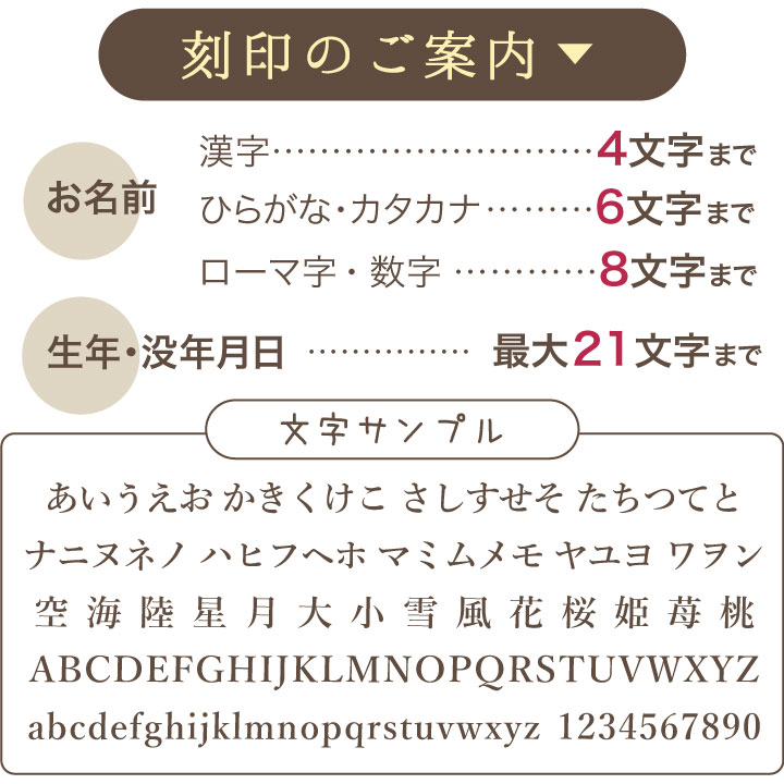 大切なお名前や日付も心を込めて刻ませていただきます(名入れの追加料金はかかりません)。