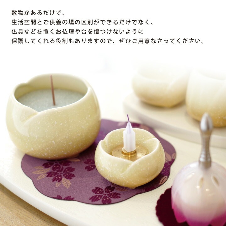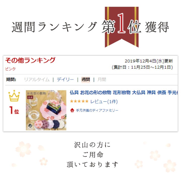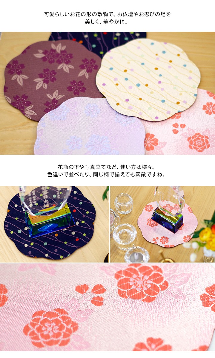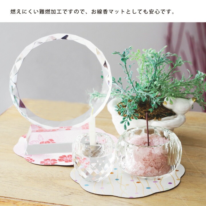 TOP 仏具仏具単品 お手入れ用品・その他その他 仏具 防炎 仏壇マット お花の形の敷物 花形 敷物 【ネコポス対応】 手元供養 水子供養 敷物 マット 花 金襴 花形 仏器敷 難燃加工 マット 和柄 ピンク 紫 紺 ネイビー 白 クリーム ドット 水玉 藤色 安全 かわいい おしゃれ 花 桜特集 価格: ¥1,200 (税込) [ポイント還元 12ポイント〜] 販売期間: 22: 1: 数量: 個 種類在庫購入花柄(ピンク)在庫あり 花柄(あずき)在庫あり 花柄(藤色)在庫なし 水玉(ネイビー)在庫あり 水玉(クリーム)在庫あり 種類在庫購入花柄(ピンク)在庫あり 花柄(あずき)在庫あり 花柄(藤色)在庫なし 水玉(ネイビー)在庫あり 水玉(クリーム)在庫あり 返品についての詳細はこちら 撮影に使用した仏壇・仏具 〇花形敷物 ピンク、クリーム ・仏具 クリスタルガラスろうそく立て ・仏具 クリスタルガラス線香立て ・カラフル香炉石 ローズクォーツ ・クリスタル位牌 撮影に使用した仏壇・仏具 〇花形敷物 あずき ・写真が入るステージ仏壇 パールホワイト ・国産 陶器の仏具セット 「やわらぎ」 ゆず ・おりん 「れんりん」 ピンク ・アーティフィシャルフラワー サイズ 直径14.5cm 備考 ■日本製※撮影に使用している仏具や位牌等は付属しません。敷物(1枚)のみのお届けです。 ※燃えにくい加工がされていますが、未然に火事を防ぐことをお約束するものではありません。 こちらもおすすめです-敷物・敷板シリーズ-