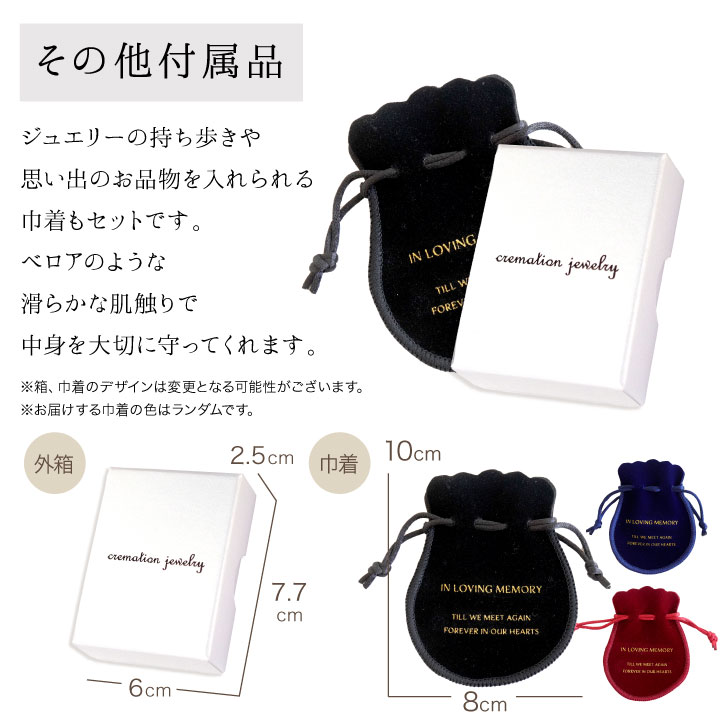 シンプルなアクセサリー感覚で身に着けていただける、お骨を納めるクリメイションジュエリーです。 ペンダントかキーホルダーか選べますので、より身近に感じられる方をお選びいただけます。 ペンダントはチェーンもステンレス製ですので、アレルギーを起こしにくい素材になっています。 巾着もセットでお届けしますので、旅行の際や着装が不安な時でもいっしょにいられますよ。 いつも一緒に、これからも一緒に居たいという気持ちを形にしながら、故人さまに見守られるあたたかさと絆を感じてください。 |