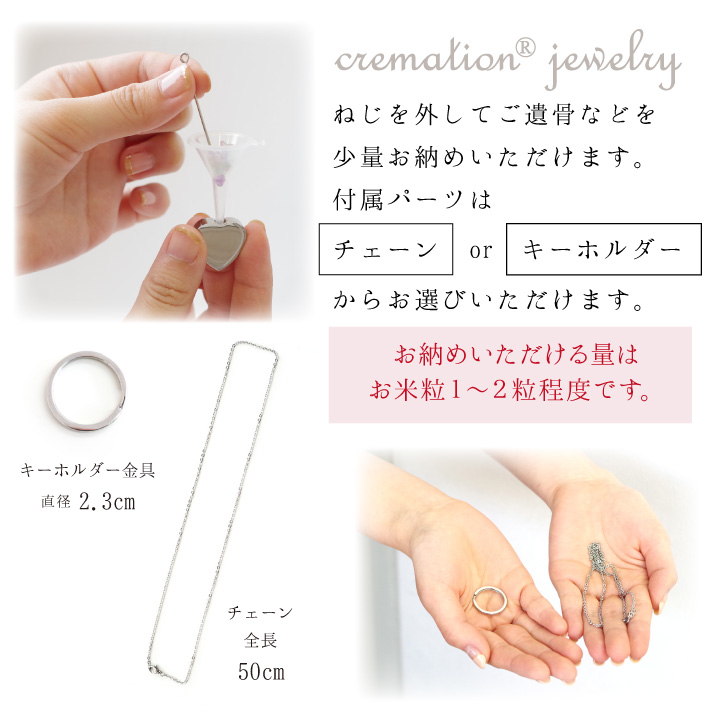 | キーホルダーかネックレスから選べる、故人を身近に感じる遺骨アクセサリー。 |