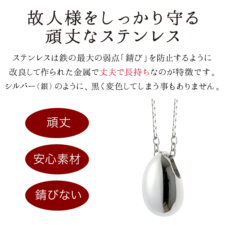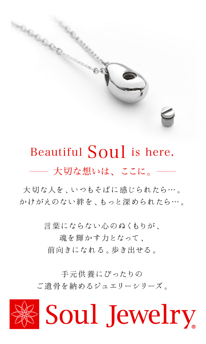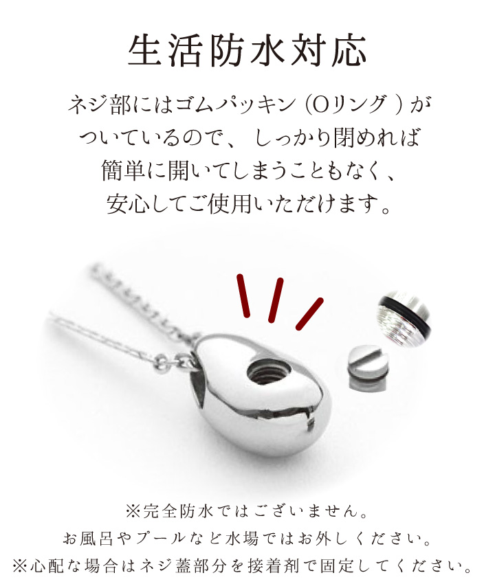 故人とずっと一緒にいたい、でも遺骨をばらばらにしてしまうのは良いことなのか、供養にならないのではないか?と不安に思われる方もいらっしゃるかもしれませんね。 仏教の考えでは、分骨は決して間違ったことではありません。 お釈迦様が亡くなったとき、8人の弟子に分骨をし、この8つに分けた骨が、やがて八大霊塔に祀られ、これが寺院の起源になったと伝えられています。 また、地域によっては分骨が習慣化されているところもあります。 一番大切なのは、故人を想うお気持ちだと思います。カプセルに納めて持ち歩いたり、小さな骨壷に納めてお部屋で一緒にすごすのも良いでしょう。 すでに納骨を済ませてしまった方も、ご遺骨を取り出すことはおおむね可能です。納骨を行ったお寺や霊園、石材店様に確認なさってください。 ●ご遺骨の納め方 こちらでご案内している遺骨ジュエリーは、ご遺骨のほか、遺髪や小さな思い出の品をお納めいただけます。 お入れできる量は、おおむね耳かき1杯分程度です。 ご遺骨をお納めいただく場合に、適切な大きさのお骨が無い場合には、 ティッシュや紙に包み、優しく手で押し、小さくしてお納めください。 また、ドライバーなどの特別な道具は必要ありません。ジュエリーの中に遺品を詰め、しっかりと蓋を閉めてください。 完全防水ではございませんので、水気のある場所では取り外すか、 水が入らないように接着剤などで固定してお使いくださいませ。 |
