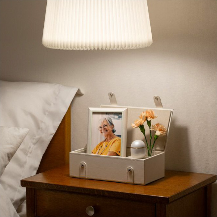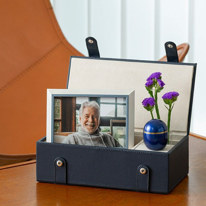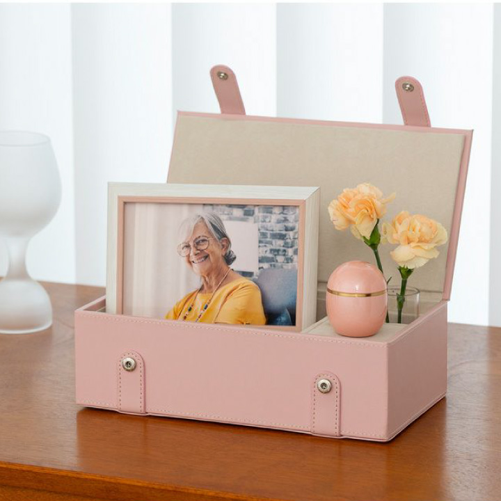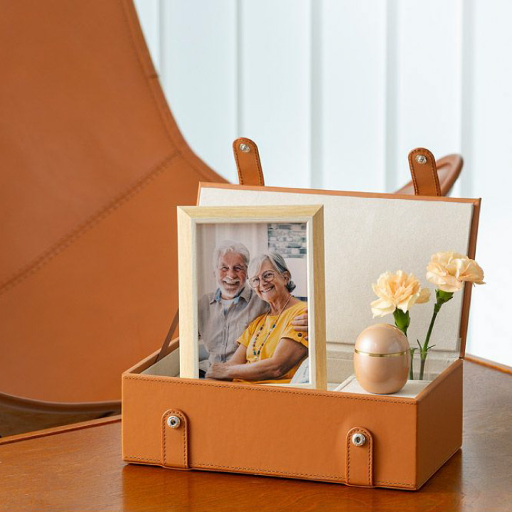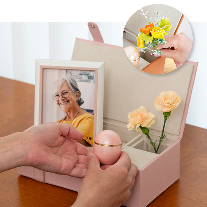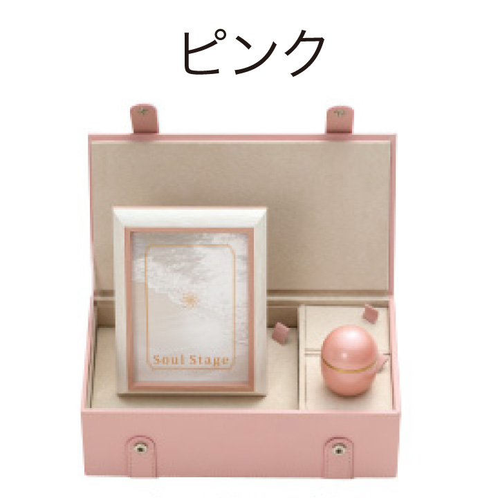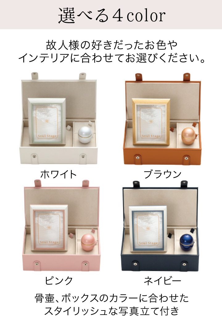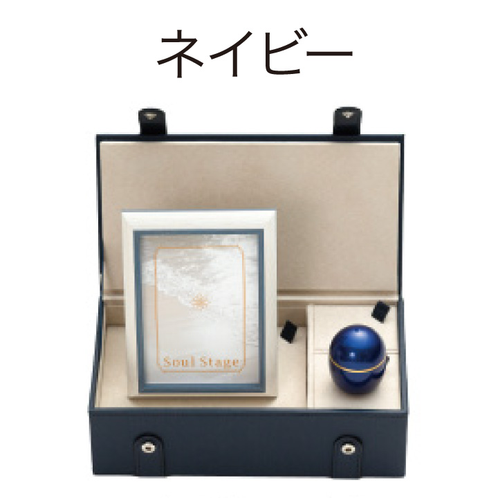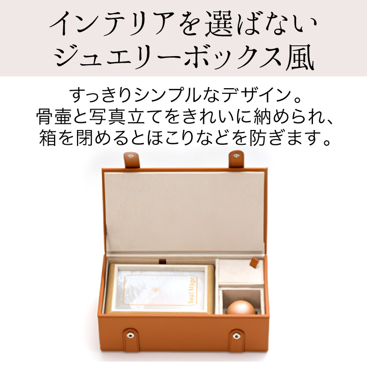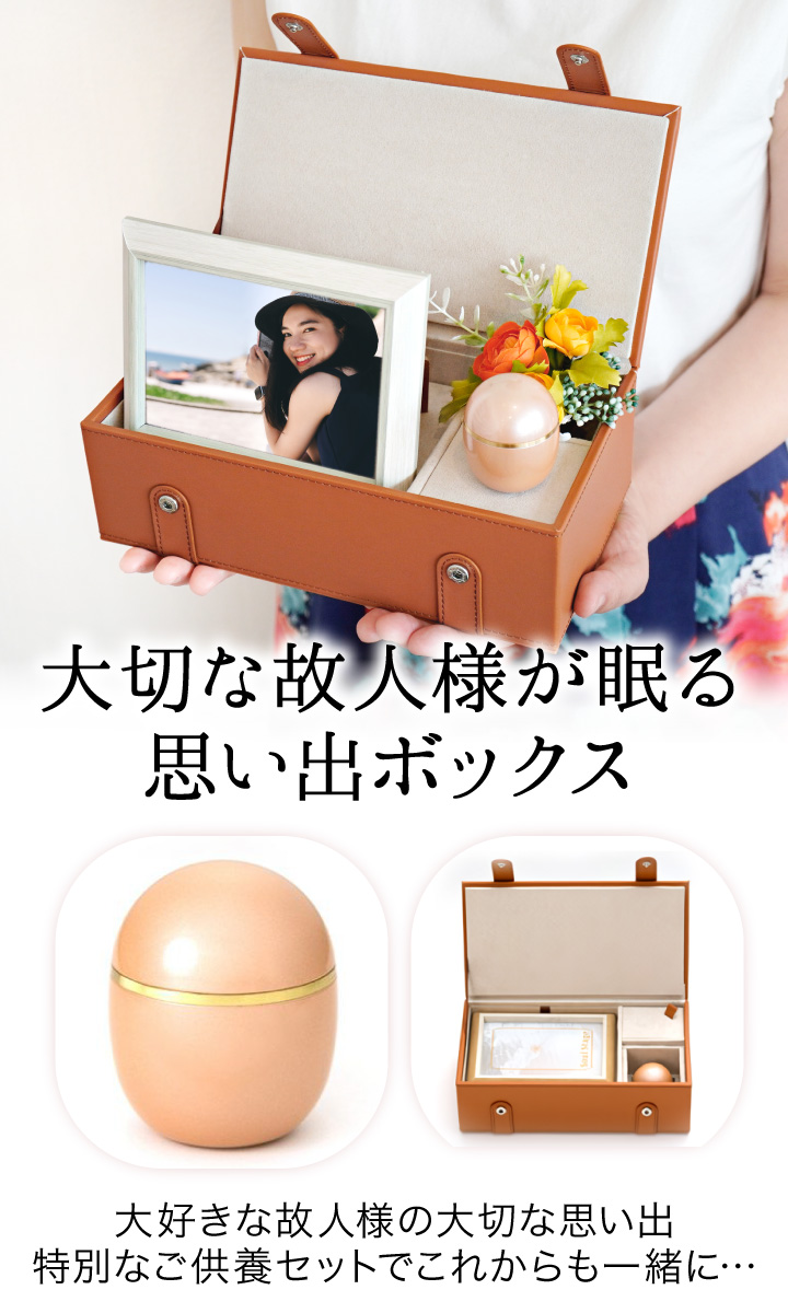 ボックス:合成皮革 ミニ骨壷:真鍮 写真立て:樹脂、ガラス |