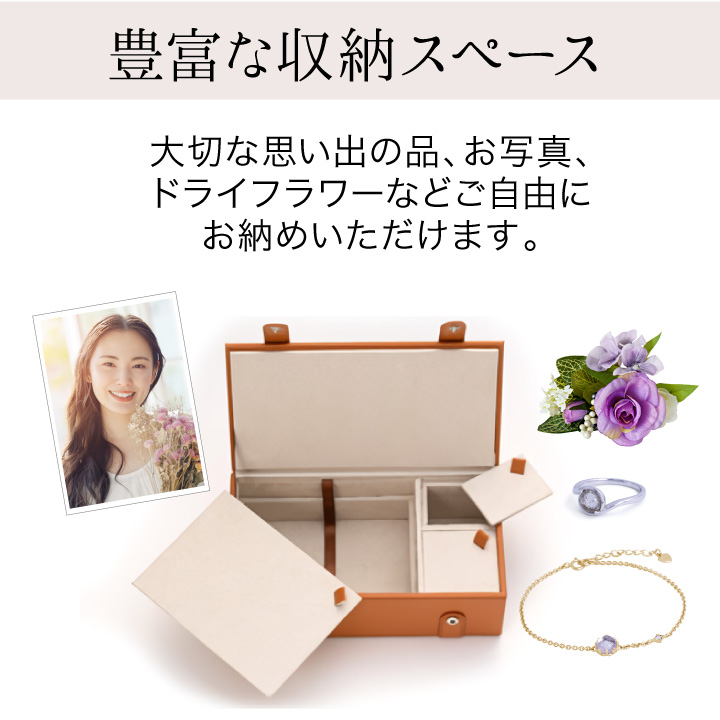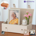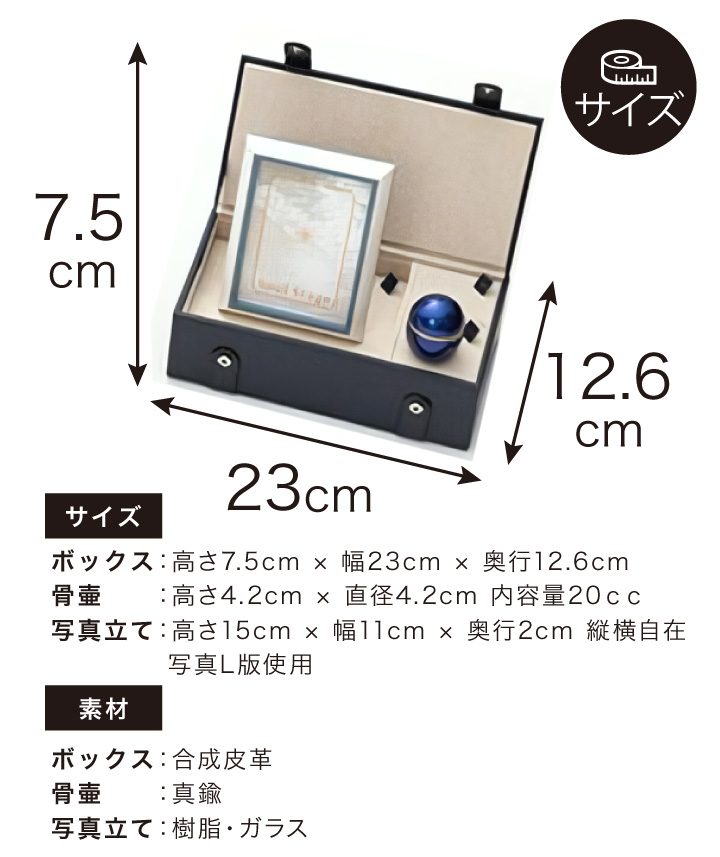 ボックス:高さ7.5cm × 幅23cm × 奥行12.6cm ミニ骨壷:高さ4.2cm × 直径4.2cm / 内容量20cc 写真立て:高さ15cm × 幅11cm × 奥行2cm 一般的なLサイズの写真をお納めいただけます(縦横自在) |